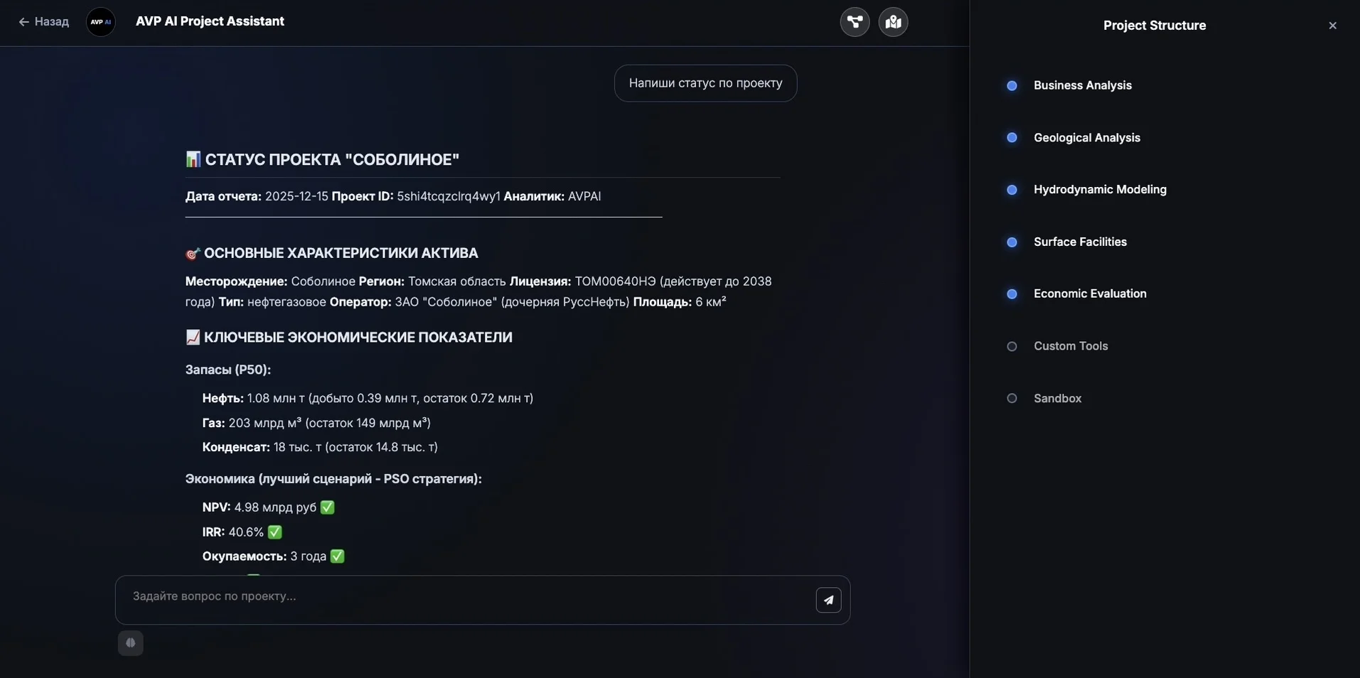 Минимум: координаты месторождения или номер лицензии. Система автоматически собирает геологические параметры, данные о соседях и рыночную информацию из открытых источников и внутренних баз данных.